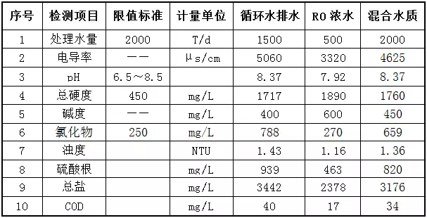廠區內現有項目產生的循環排污水和反滲透濃水均排入10000 m3/d污水處理廠內處理。由于此部分水量較大,對污水處理站負擔大,且對水資源也是一種浪費。經齊魯制藥相關技術人員化驗得知,此部分高濃度廢水電導率、硬度、濁度和鹽分較高,而COD較低,如果直接排入污水處理車間進行處理不太合理,不僅會加重污水處理的成本,處理效果也不夠理想。