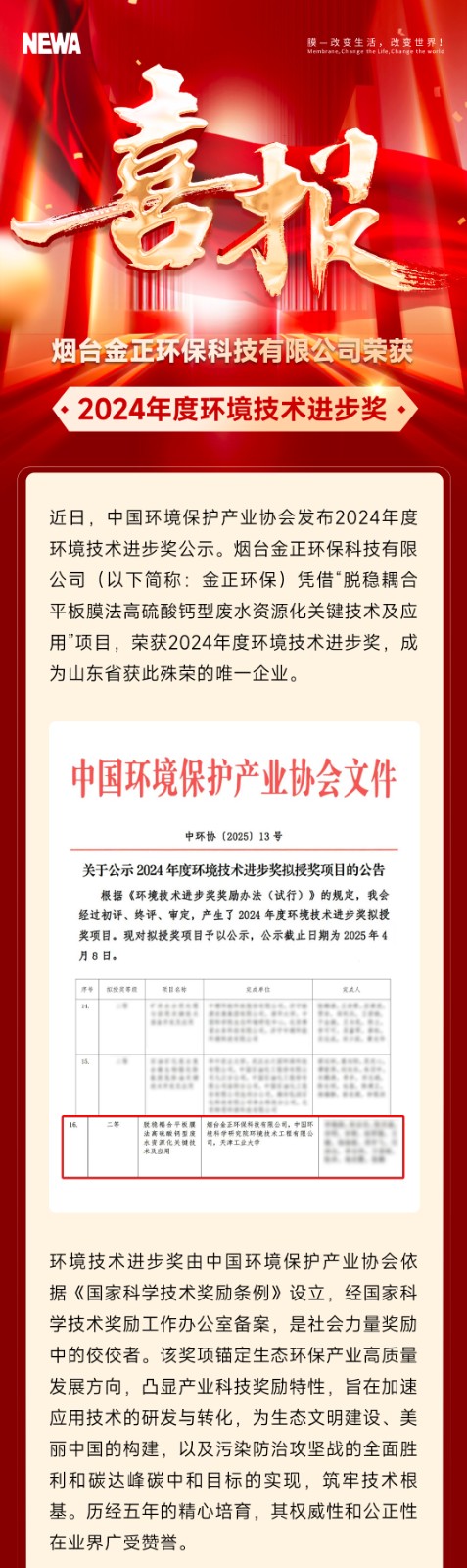 喜報|煙臺金正環保榮獲2024年度環境技術進步獎